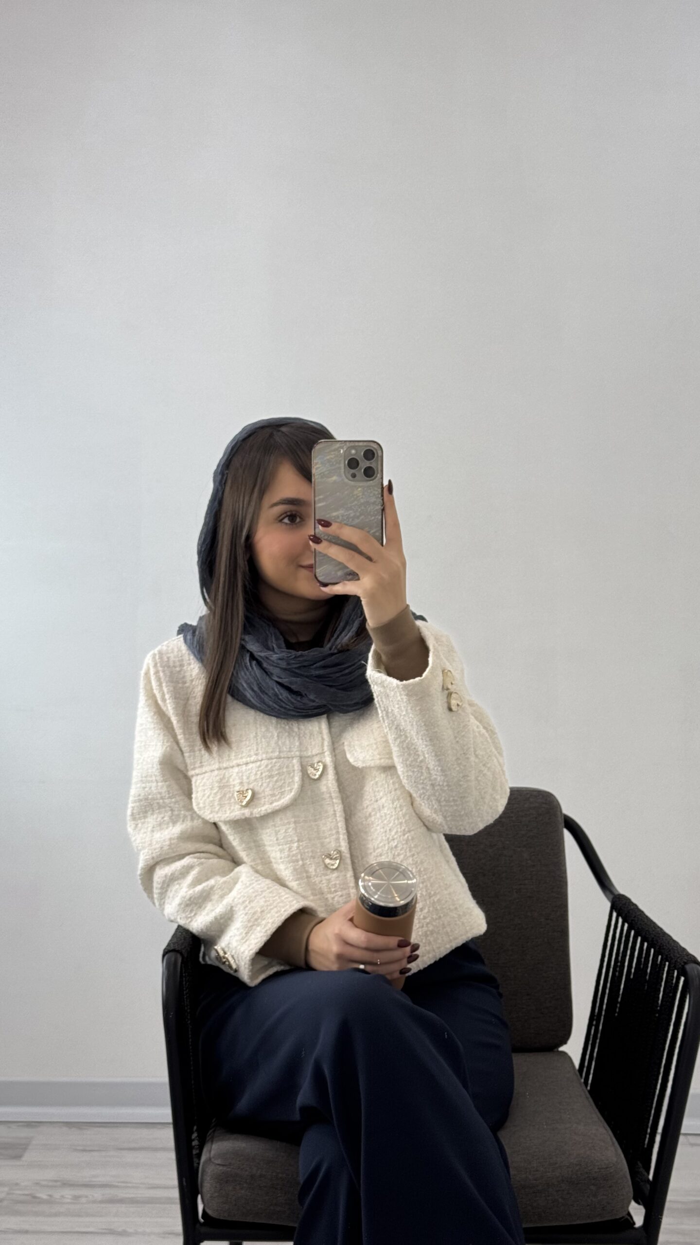 این کت شنل سفید با دکمههای قلبی دقیقاً مثل یه تکه ابره که نور طلایی روش افتاده… توش لمههای طلایی خیلی ظریف داره که وقتی نور میافته روش، یه درخشش ملایم و دخترونه میگیره. جنس نرم، مدل شیک، و از همه مهمتر، اون حس لطافتی که وقتی تنته، میده. داخلش کاملا آسترکشی شده ✨ اگه دنبال یه لباس خاص میگردی که هم کیوته هم شیک، هم سادهست هم چشمگیر… واقعاً این یکی انتخابته. فریسایز مناسب 36 تا 40